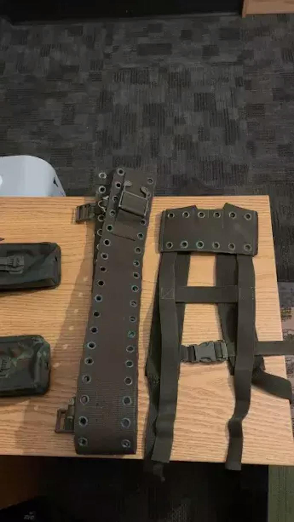 - Includes a belt, harness, and two magazine pouches